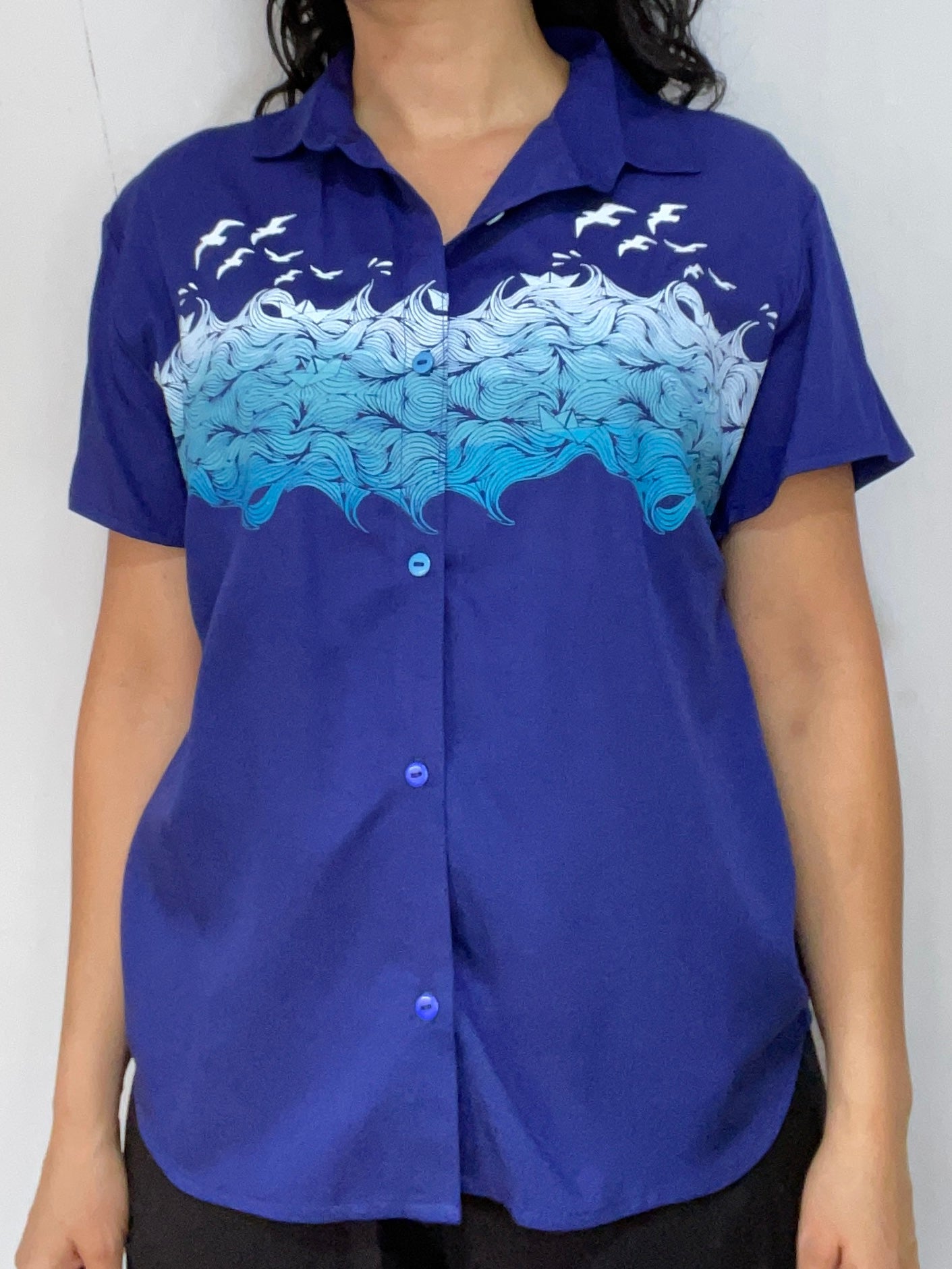 Blusa en Chalis azul oscuro con con barcos estampados con tinta base agua.