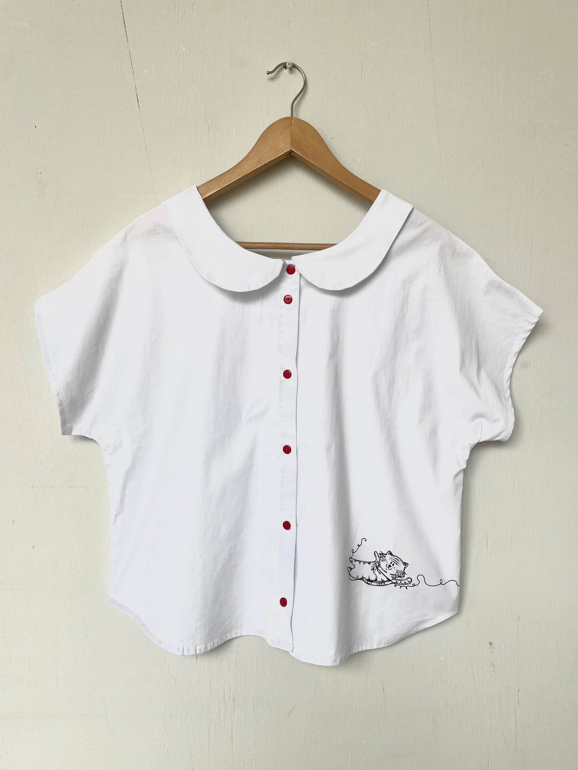 Blusa en Popelina (algodón strech) blanca con gaticos negros estampados con tinta base agua.