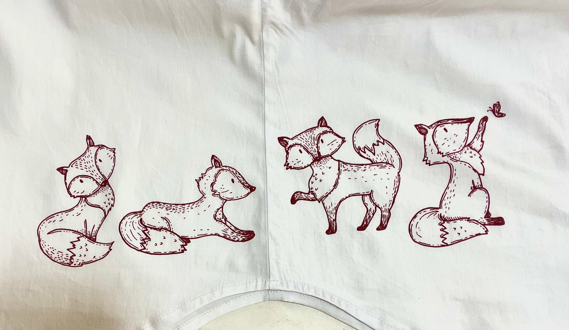Blusa en Popelina (algodón strech) blanca con zorritos vinotinto estampados con tinta base agua.