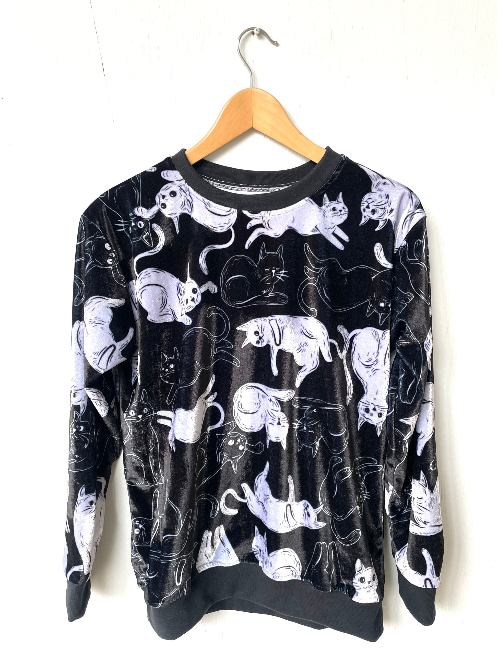 Buzo en velvetín (poliéster) con textura aterciopelada, estampado por sublimación, cuello puño y cintura en resorte negro.
