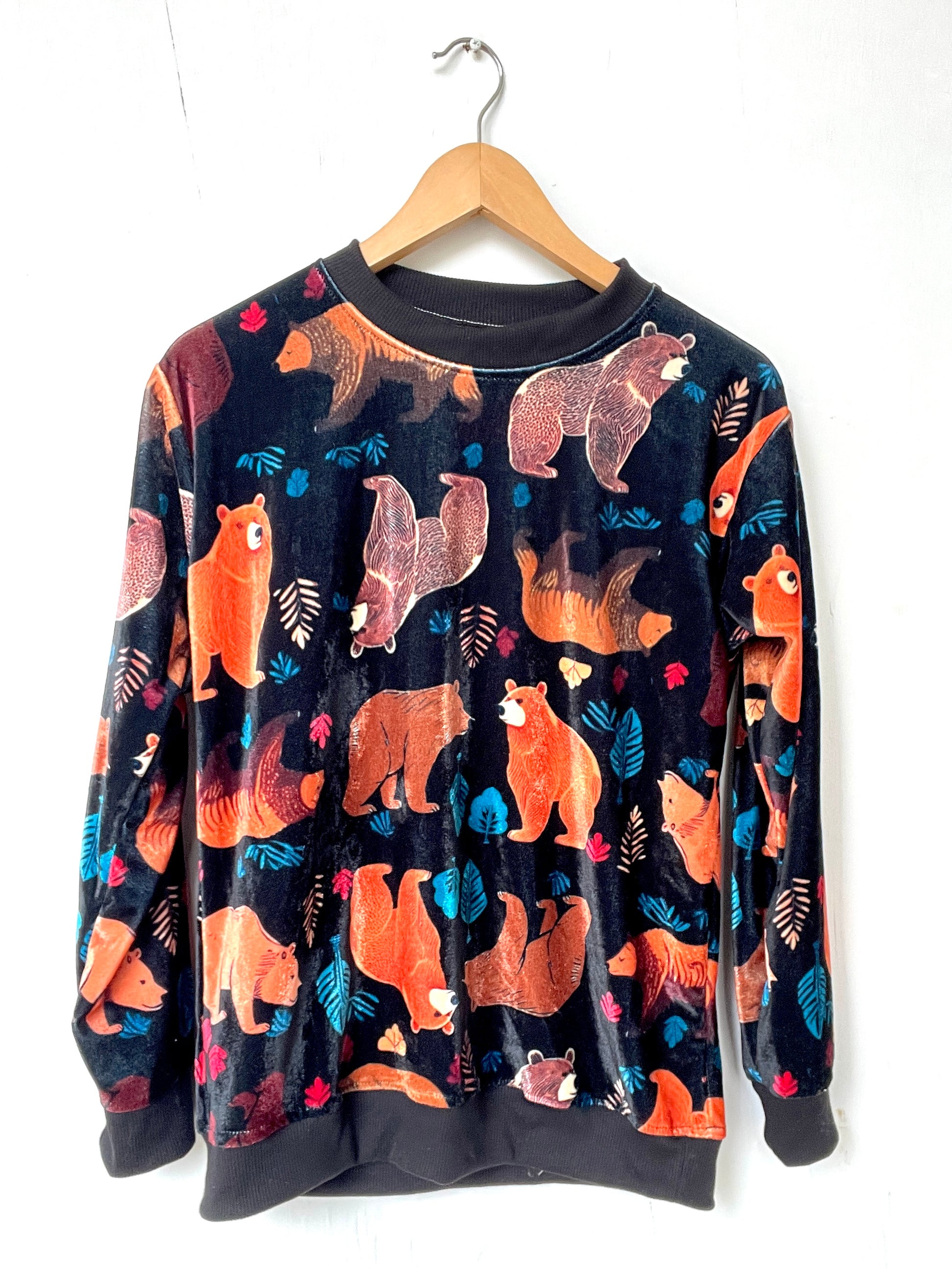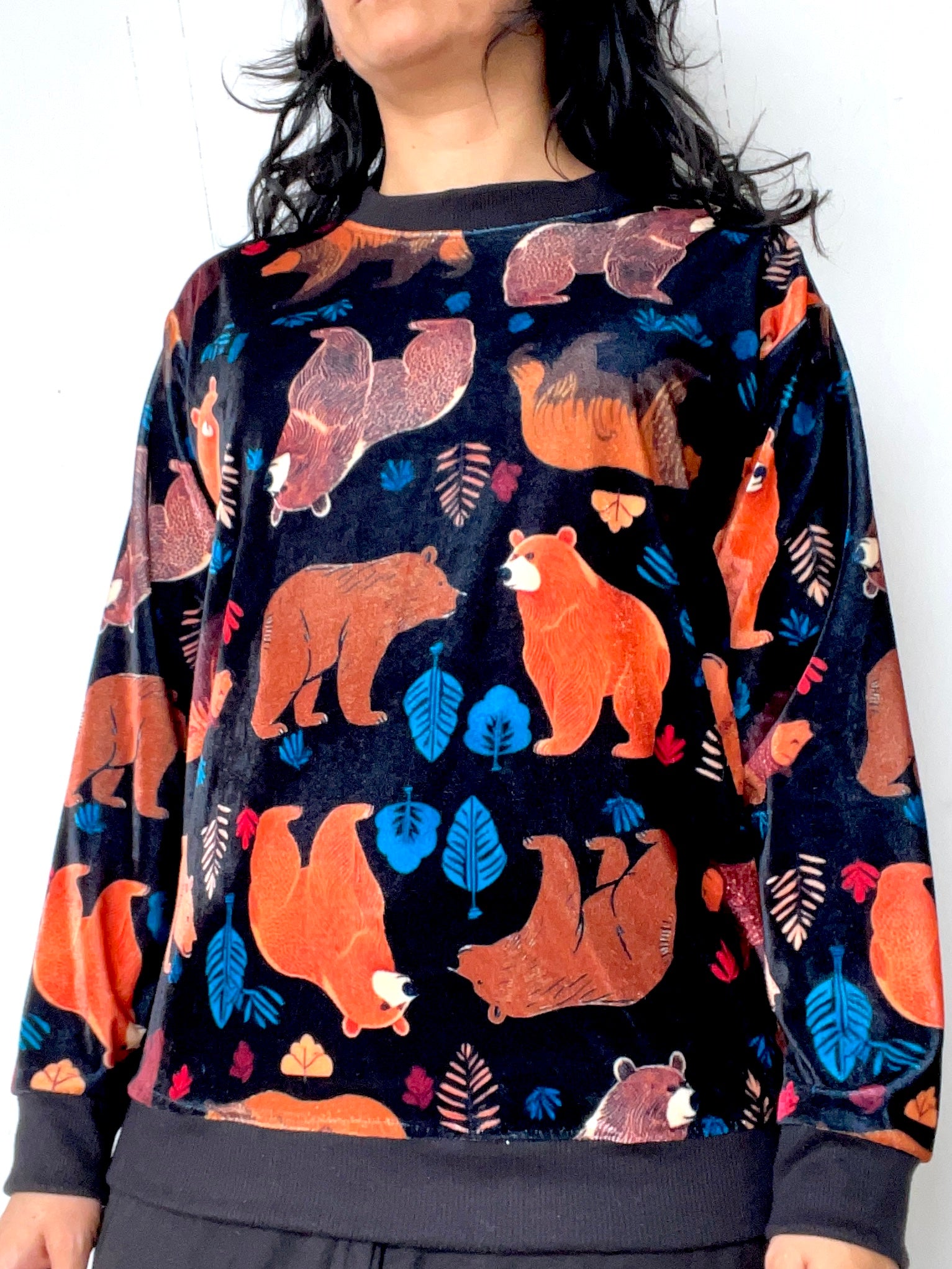 Buzo en velvetín (poliéster) con textura aterciopelada, estampado por sublimación, cuello puño y cintura en resorte negro.