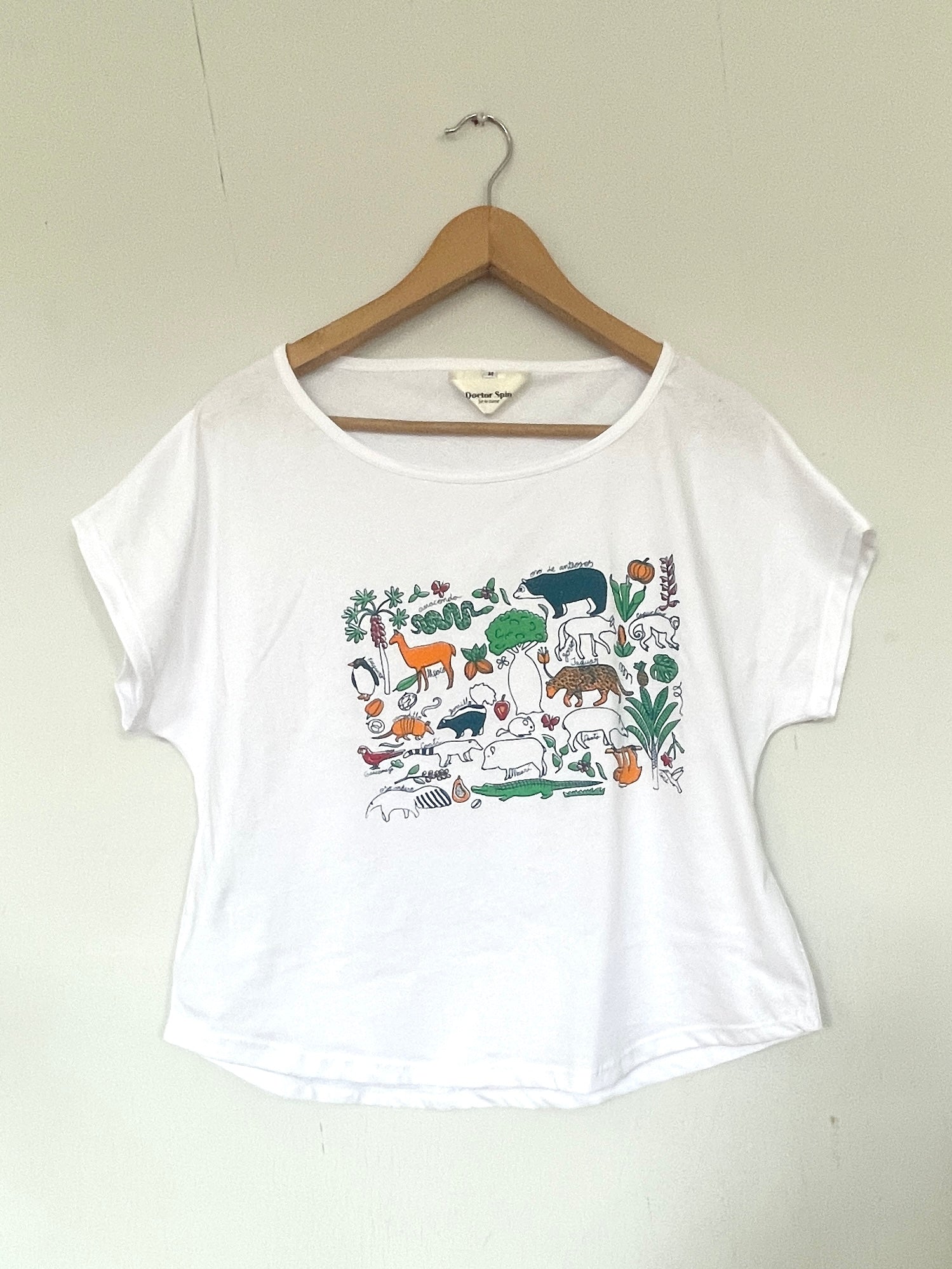 Camiseta en franela 100% algodón blanca con estampado de animales de suramérica.