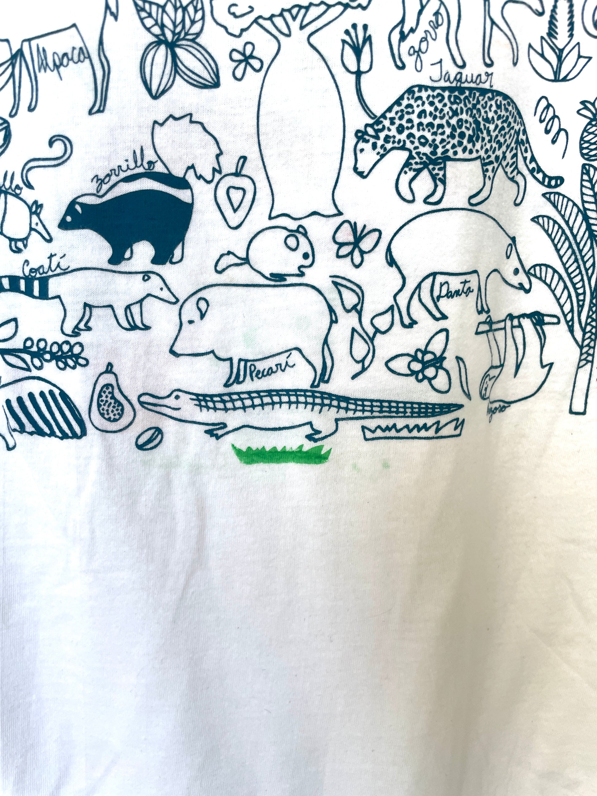 Camiseta en franela 100% algodón blanca con estampado de animales de suramérica con tinta base agua.