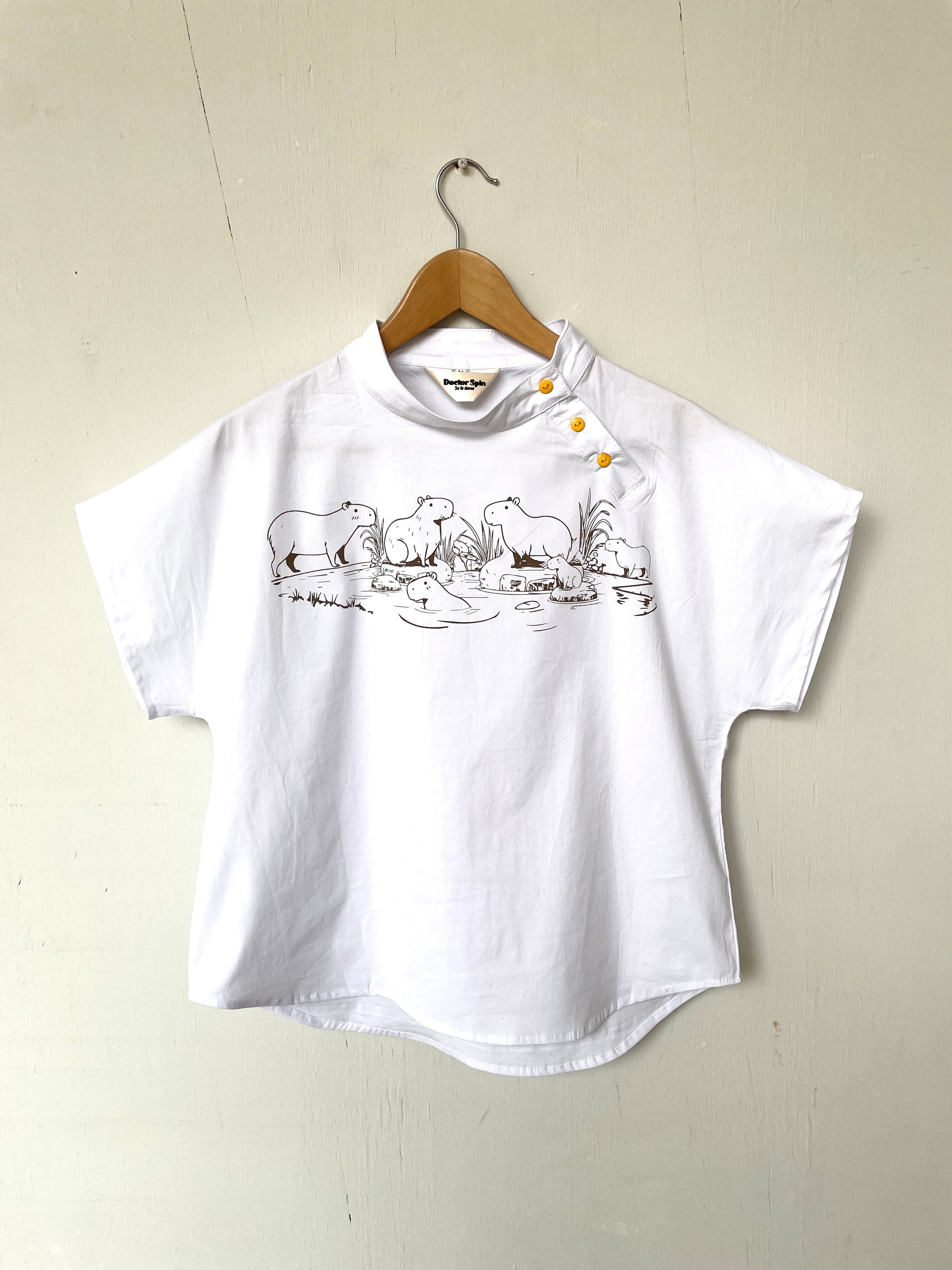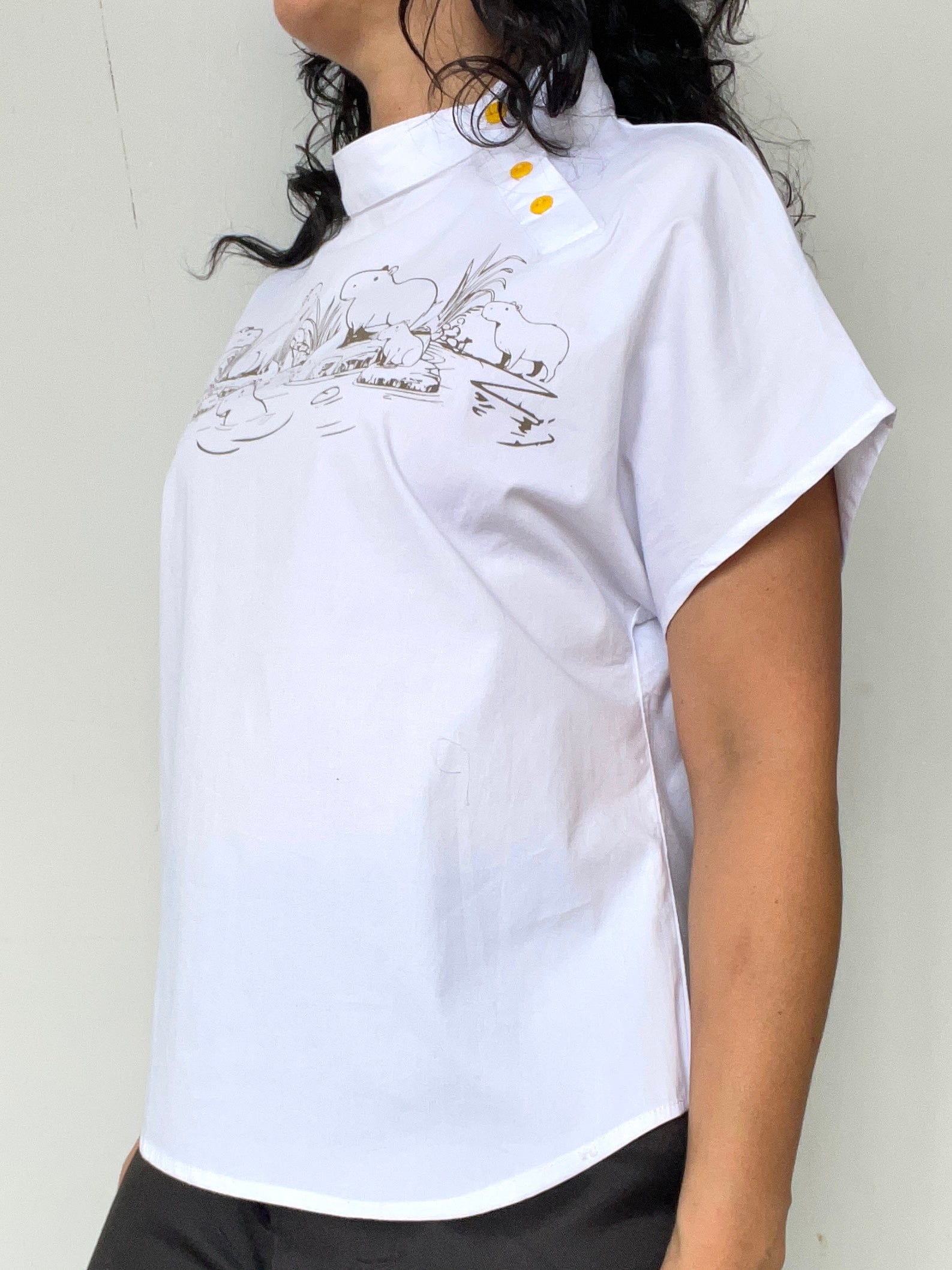 Blusa en Popelina (algodón strech) blanca con chigüiros estampados con tinta base agua.